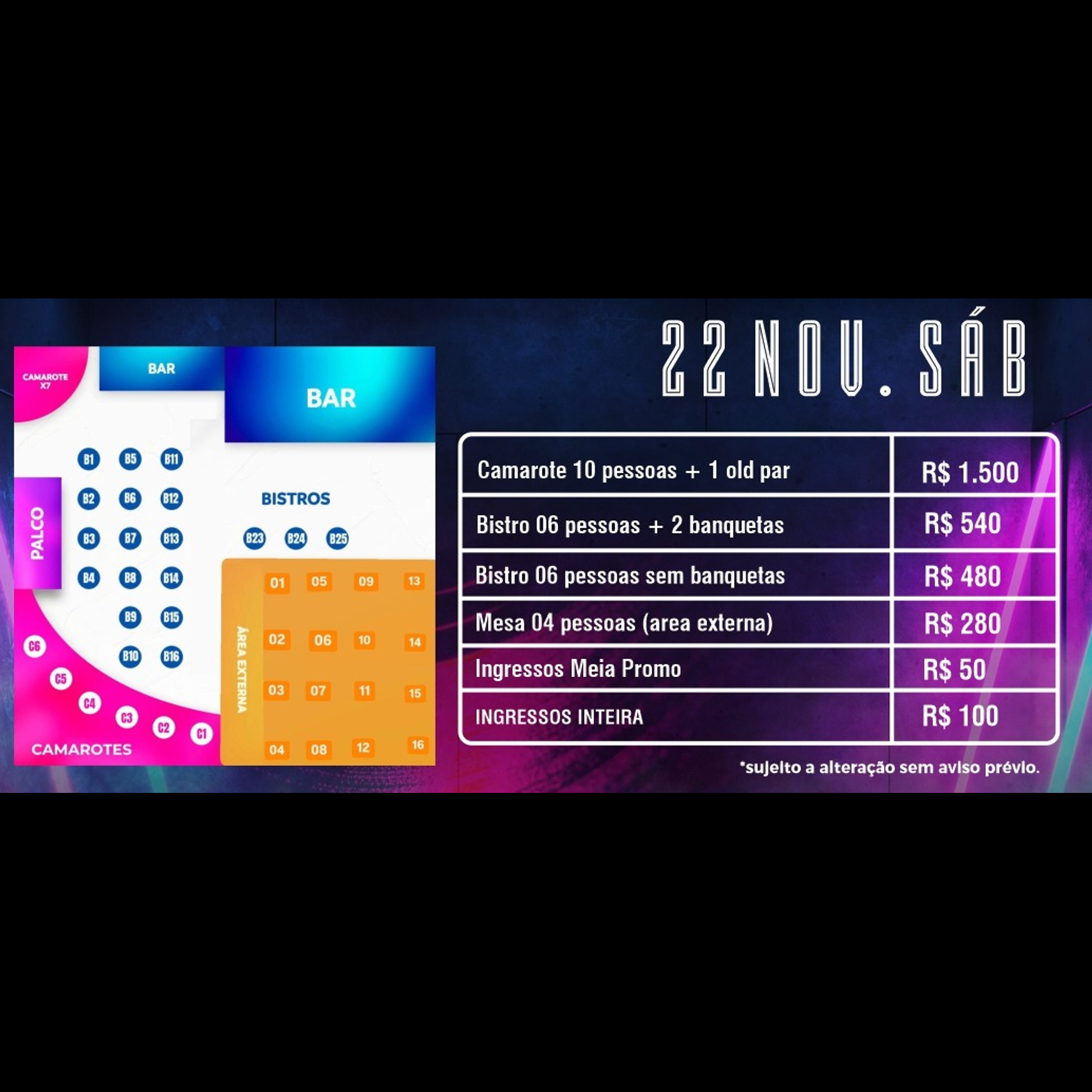 Usando o mapa como referência, escolha o setor desejado. Na próxima etapa você poderá selecionar a quantidade de lugares. Atente para o fato de que os setores podem possuir preços diferentes.